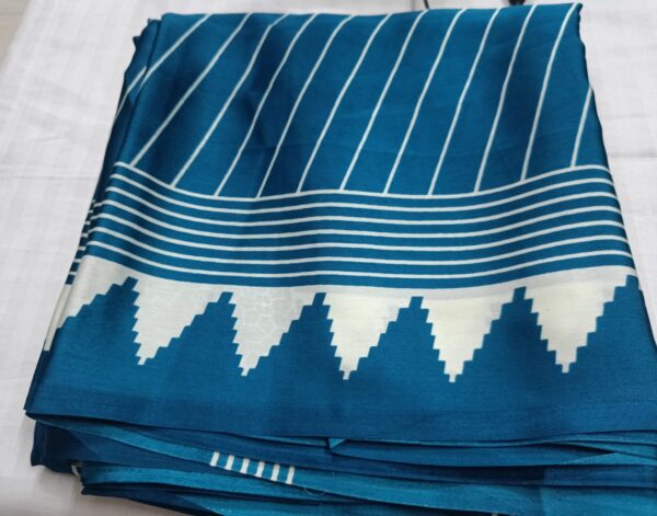 A beautifully crafted Temple Horizontal Lining Ajrak Semi Modal Silk Saree featuring a rich navy base, handcrafted Ajrak-inspired motifs, and a stunning abstract contrast pallu. Lightweight, smooth, and perfect for festive occasions or elegant daily wear.